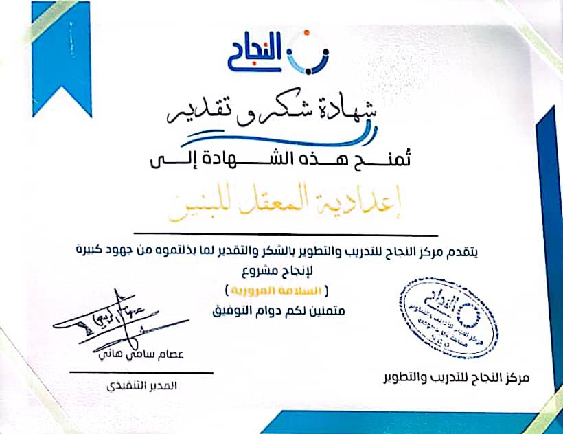 حصلت إعدادية المعقل للبنين على شهادة شكر وتقدير مقدّمة من مركز النجاح للتدريب والتطوير، وذلك تثمينًا للجهود الكبيرة التي بذلها كادر المدرسة وإدارتها المتميزة، ودورهم الفعّال في نجاح مشروع السلامة المرورية.